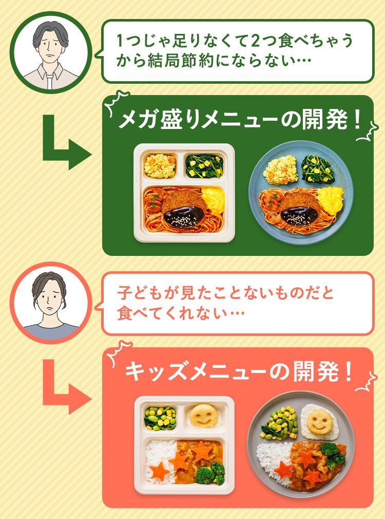 - メニューの種類が豊富で、とてもおいしいと思います。現在食事制限をしていて栄養バランスも良くとても助かります。今後もメニューが色々と新しいものが出たらいいなと思います。40代 / 男性